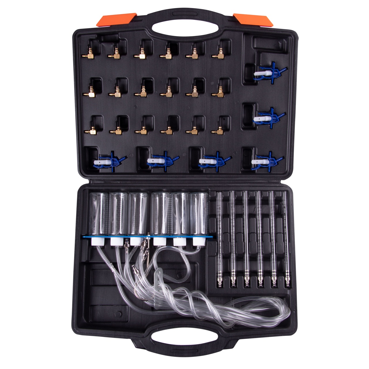 Тестирование дизельных форсунок двигателей с системой впрыска Сommon-Rail по обратному сливу топлива без снятия форсунок с двигателя, с помощью набора можно измерить количество топлива, которое каждая форсунка возвращает в топливный бак.