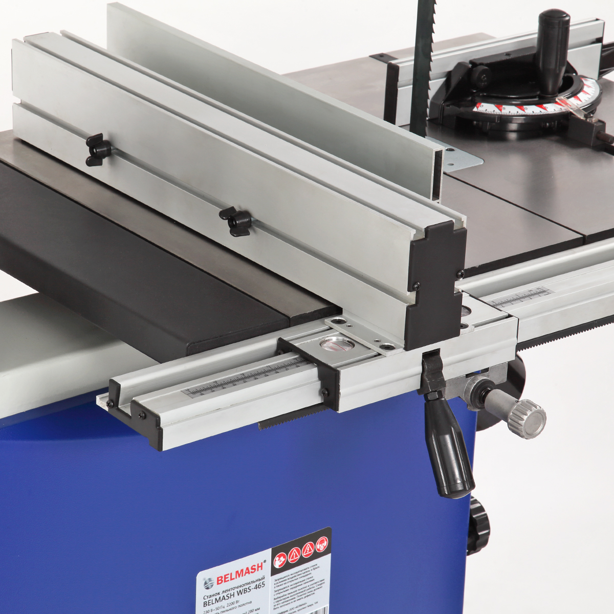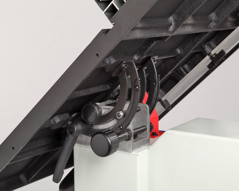 Основной стол выполнен из чугуна с углом наклона от -5 до +45 градусов. Для работы с большими заготовками в комплектации предусмотрено расширение из листовой стали, общий размер рабочей поверхности в итоге составляет 730х480 мм. На передней направляющей с помощью эксцентрикового зажима закрепляется параллельный упор с системой точной подстройки. Она оснащена шкалами в миллиметрах и дюймах для точного позиционирования. Параллельная направляющая может устанавливаться как вертикально, так и горизонтально, в зависимости от высоты заготовки. На основном столе имеется два Т-образных паза стандартного размера 19х9,5 мм (по обе стороны от полотна) для углового упора (-60...+60 град.).