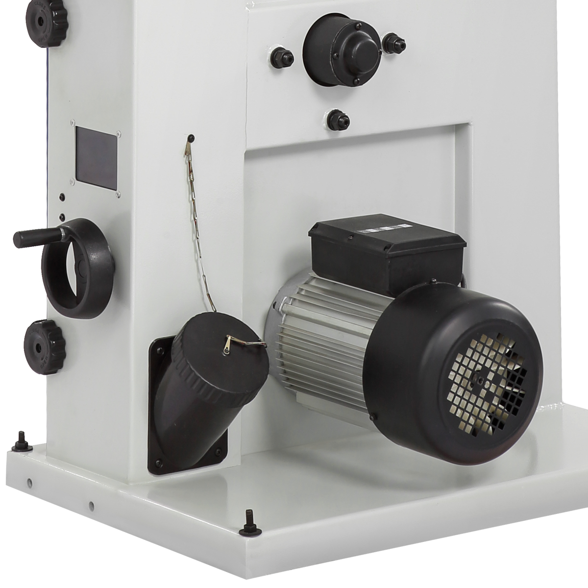 Модель комплектуется однофазным асинхронным двигателем мощностью 2200 Вт, чего с легкостью хватает для распила заготовок высотой до 280 мм. Ширина заготовки ограничена просветом до рамы, он составляет - 465 мм. Станок имеет две скорости пильного полотна 420 и 840 м/мин. Их смена осуществляется путем перебрасывания клинового ремня на шкивах двигателя.