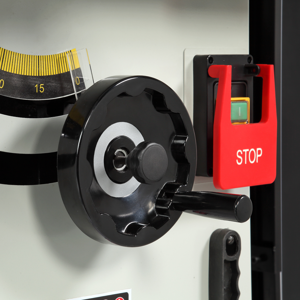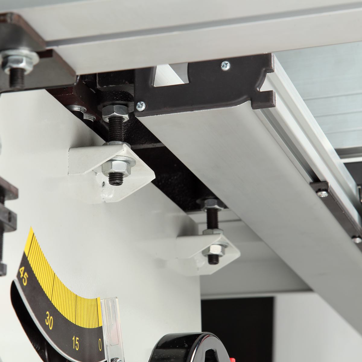 Станок оснащен основным чугунным столом, двумя дополнительными секциями из листовой стали, подвижным столом из алюминиевого профиля и столом поперечного реза из стального профиля. Основной и подвижный столы имеют по одному пазу для установки угловых упоров или дополнительных приспособлений.
