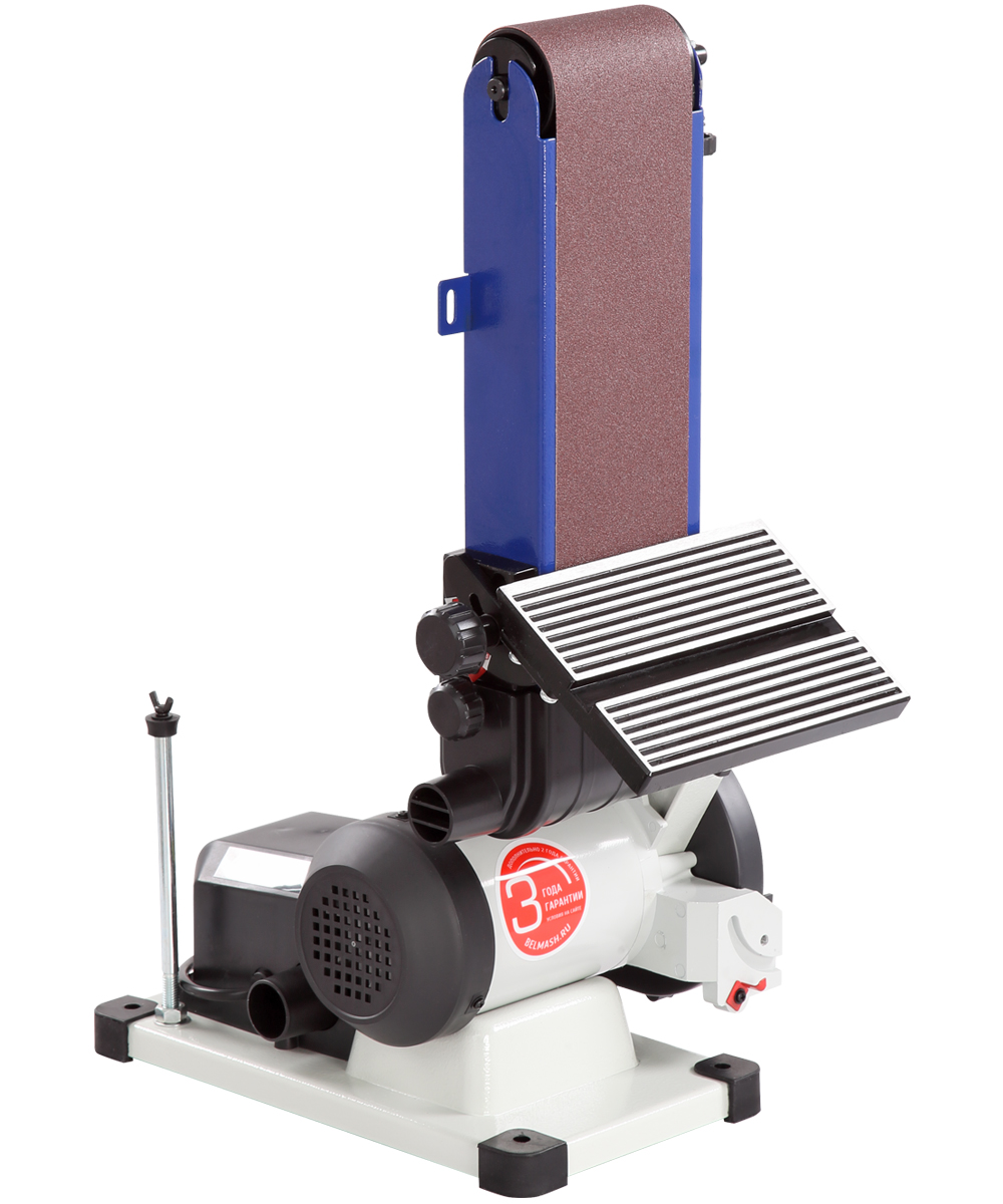 Рабочий стол съемный, устанавливается и на ленточном, и на тарельчатом шлифовальном узле. Угол наклона стола от 0 до 45 град. Угловой упор помогает выдерживать нужный угол при шлифовании заготовки (от -30 до +30 град.)