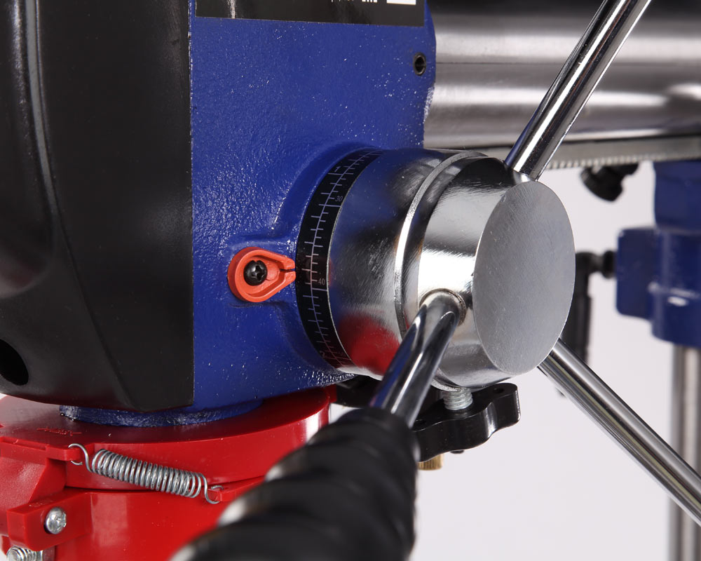 Заготовку можно крепить как к рабочему столу, так и к основанию, все зависит от ее размера. В комплекте предусмотрены тиски. Для их крепления есть шесть пазов на рабочем столе и два на основании. Шкала, расположенная на рукоятке регулировки глубины сверления, показывает ход пиноли шпинделя, с ее помощью можно настраивать ход пиноли, для этого необходимо провернуть шкалу, стрелка на корпусе будет показывать значение, на которое будет возможно погружение сверла, затем затянуть барашек. Наконечники тройной рукояти удобной формы, что способствует плавной подаче сверла к заготовке. максимальный ход пиноли шпинделя 80 мм. На станке предусмотрен лазерный указатель, который позволяет точно определить точку входа режущего инструмента в заготовку.