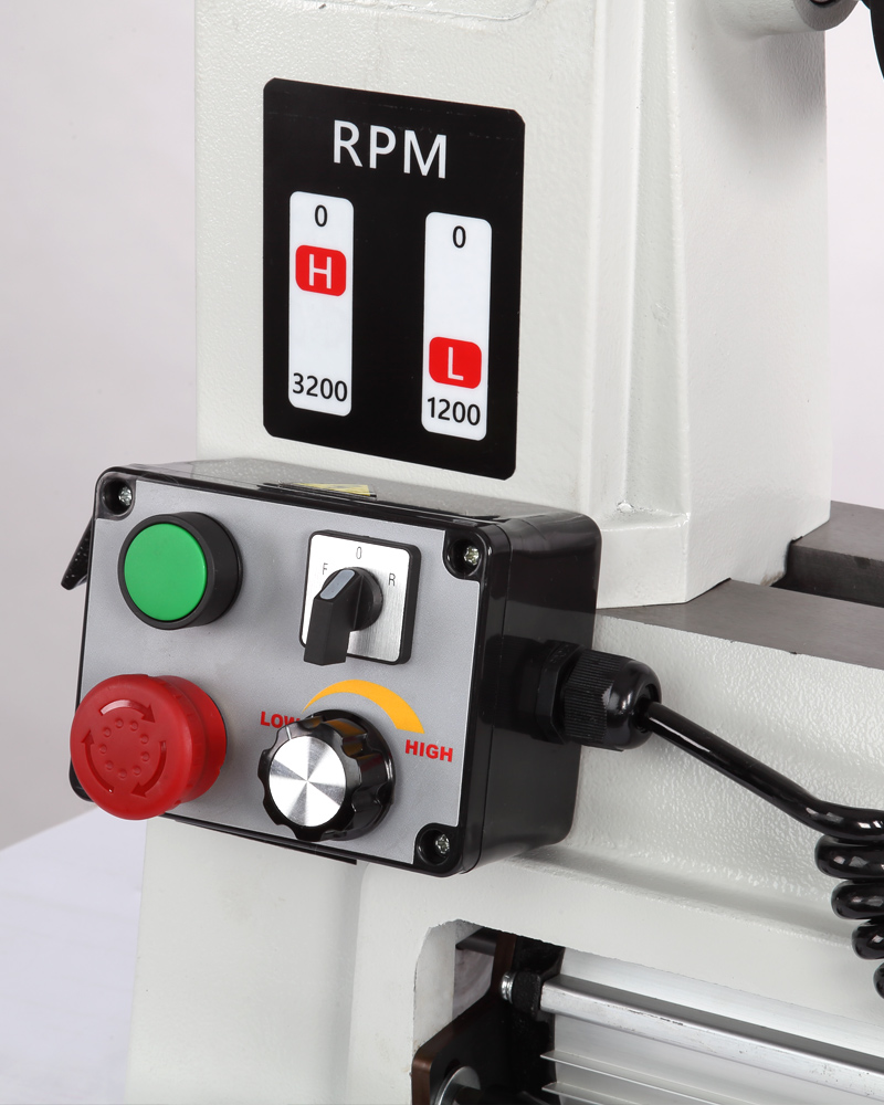 Модель имеет асинхронный двигатель – 750 Вт. Диапазонов скоростей два: низкий - от 0 до 1200 об./мин., и высокий – от 0 до 3200 об./мин. Скорость регулируется плавно с помощью частотного преобразователя. Отличительная особенность – выносной пульт управления с магнитной фиксацией.