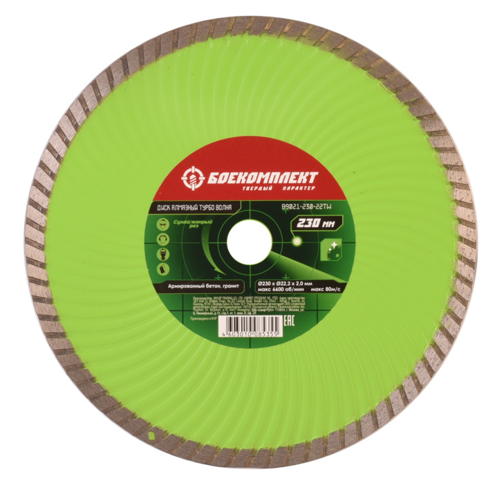 Особенности : Высокое содержание алмазов и высота режущей кромки 10 мм увеличивают износостойкость и срок эксплуатации диска, технология самозаточки позволяет диску сохранять высокую скорость реза даже при длительной работе, тело диска из стали марки 65Mn для ровного реза, метод горячей опрессовки при производстве для наилучшей адгезии. |Диаметр диска (мм) : 230 |Посадочный размер (мм) : 22,23 |Тип кромки : Турбо волна |Обрабатываемый материал : Армированный бетон, гранит |Тип реза : Мокрый/сухой |Артикул : B9021-230-22TW |Производитель : БОЕКОМПЛЕКТ |Посадочный размер (мм) : 22,23 |Высота алмазного слоя (мм) : 10 |Тип кромки : Турбо волна |Технология производства : Горячее прессование |Диаметр диска (мм) : 230 |Обрабатываемый материал : Армированный бетон, гранит |Вид упаковки : Конверт картонный |Габариты в упаковке (ДхШхВ, см) : 26x24x0,1 |Основной штрихкод : 4603010085355 |