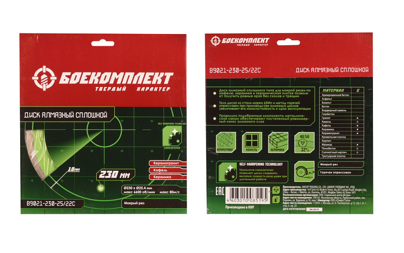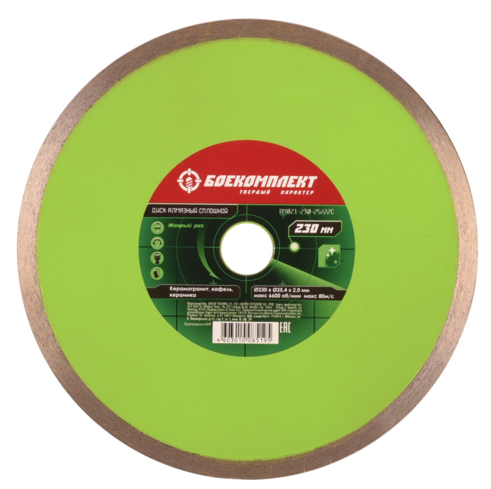 Особенности : Высокое содержание алмазов и высота режущей кромки 10 мм увеличивают износостойкость и срок эксплуатации диска, технология самозаточки позволяет диску сохранять высокую скорость реза даже при длительной работе, тело диска из стали марки 65Mn для ровного реза, метод горячей опрессовки при производстве для наилучшей адгезии. |Диаметр диска (мм) : 230 |Посадочный размер (мм) : 25/22,23 |Тип кромки : Сплошной |Обрабатываемый материал : Керамогранит, кафель, керамика |Тип реза : Мокрый |Артикул : B9021-230-25/22C |Производитель : БОЕКОМПЛЕКТ |Посадочный размер (мм) : 25/22,23 |Высота алмазного слоя (мм) : 10 |Тип кромки : Сплошной |Технология производства : Горячее прессование |Диаметр диска (мм) : 230 |Обрабатываемый материал : Керамогранит, кафель, керамика |Вид упаковки : Конверт картонный |Габариты в упаковке (ДхШхВ, см) : 26x24x0,1 |Основной штрихкод : 4603010085195 |