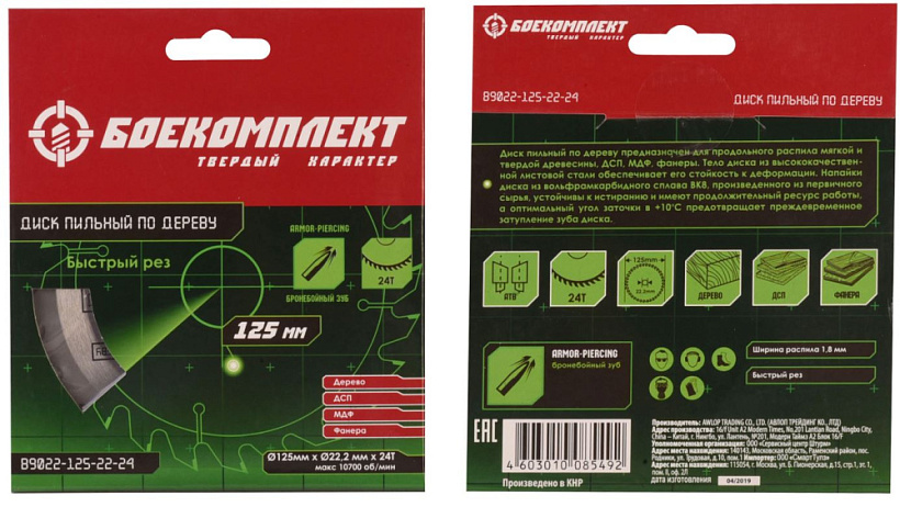 Особенности : Чистый рез! При работе данным диском потребление мощности на 30% МЕНЬШЕ, что продлевает срок службы электроинтрумента!Тело диска из высококачественной листовой стали обеспечивает его стойкость к деформации. Напайки диска из вольфрамкарбидного сплава ВК8, произведенного из первичного сырья, устойчивы к истиранию и имеют продолжительный ресурс работы, а оптимальный угол заточки в +10 ̊C предотвращает преждевременное затупление зуба диска. |Обрабатываемый материал : По дереву |Диаметр диска (мм) : 125 |Посадочный размер (мм) : 22,23 |Количество зубьев (шт) : 24 |Тип реза : Чистый |Артикул : B9022-125-22-24 |Производитель : БОЕКОМПЛЕКТ |Посадочный размер (мм) : 22,23 |Масса нетто (в собранном, рабочем состоянии, но без аксессуаров) (кг) : 0,1 |Назначение : Применяется для продольного и поперечного распила мягкой и твердой древесины, фанеры, ДСП, ламината, пластика и плитных материалов. |Диаметр диска (мм) : 125 |Диаметр посадочного отверстия (мм) : 22,23 |Толщина тела диска (мм) : 1,2 |Толщина реза (мм) : 2 |Обрабатываемый материал : По дереву |Количество зубьев (шт) : 24 |Вид упаковки : Конверт картонный |Габариты в упаковке (ДхШхВ, см) : 15x13x0,1 |Основной штрихкод : 4603010085492 |
