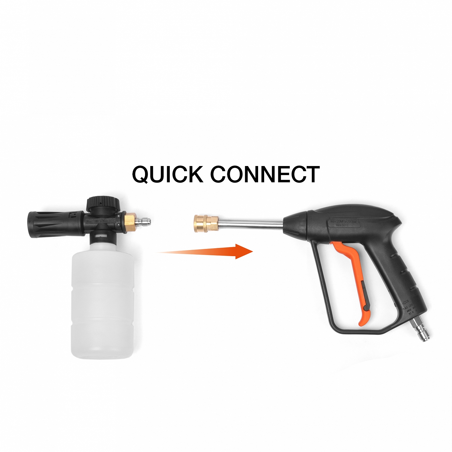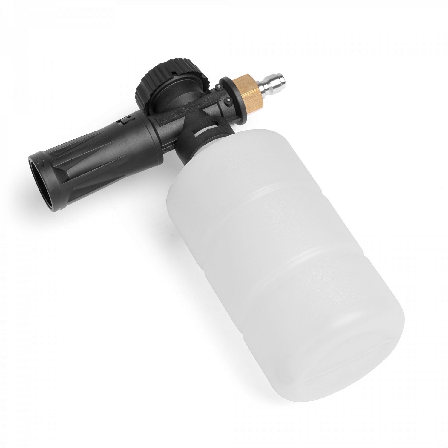 Специальная насадка на пистолет с резервуаром для жидких моющих средств позволяет экономично и быстро наносить пену на очищаемую поверхность.
