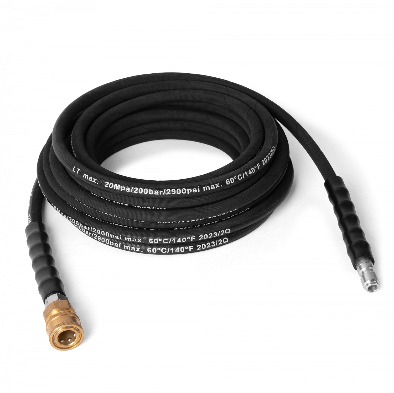 Армированный шланг высокого давления длиной 10 метров имеет запас прочности, значительно превосходящий мощность насоса, благодаря чему он с легкостью выдерживает пиковые нагрузки в моменты запуска и остановки двигателя, а также обладает устойчивостью к внешнему механическому воздействию.