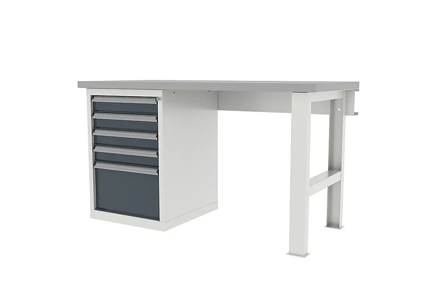 Корпус и ящики тумбы, опора и другие элементы верстака имеют жесткую и надежную цельносварную конструкцию. Дополнительные усилители и ребра жесткости обеспечивают повышенную прочность и позволяют выдерживать равнораспределенную нагрузку в 3000 кг. Поверхности покрыты порошковой эпоксидно-полиэфирной краской серого цвета (RAL 7001 и 7016) с глянцевой структурой и высокой механической и атмосферной стойкостью. Предусмотрена возможность жесткого крепления к полу.