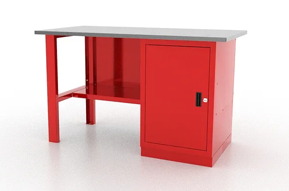 Верстак изготовлен из качественной стали, имеет прочную и надежную конструкцию. Поверхности покрыты порошковой эпоксидно-полиэфирной краской красного цвета (RAL 3000) с глянцевой структурой.