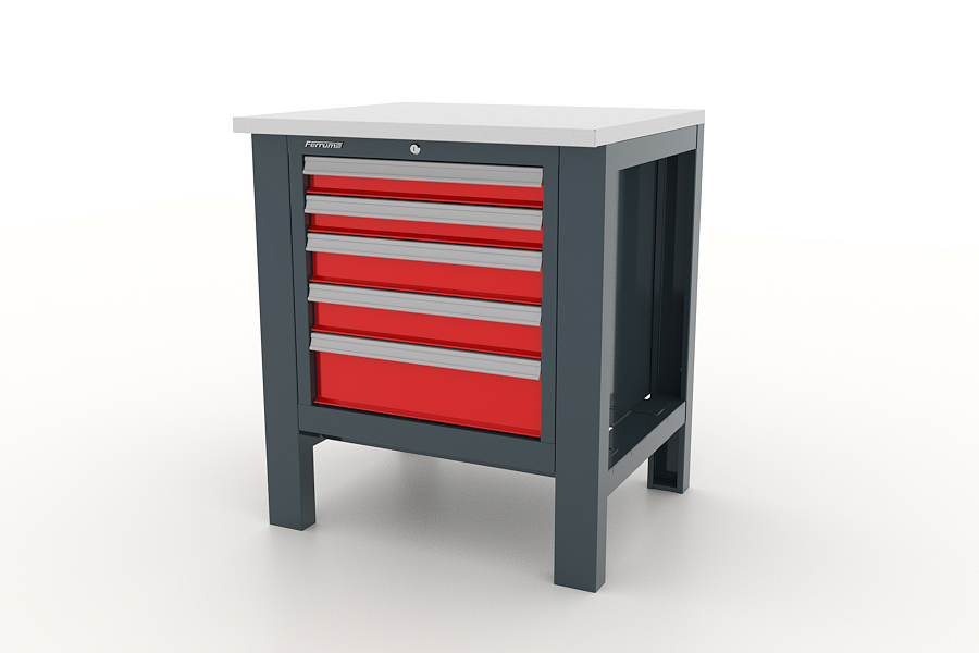 В основе верстака усовершенствованной конструкции расположена особо прочная стальная рама с силовыми балками и верстачными опорами. Все поверхности покрыты высококачественной порошковой эпоксидно-полиэфирной краской RAL 7016 / 3000 с глянцевой текстурой. Столешница 745х620 мм выполнена из влагостойкой шлифованной фанеры толщиной 27 мм и покрыта оцинкованным кожухом 1,2 мм. Торцы столешницы закрыты кожухом со всех 4 сторон, а с фасадной части он подвернут под столешницу.