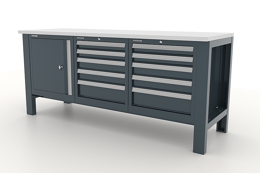 Промышленный металлический верстак с тремя тумбами Ferrum серии Premium предназначен для проведения слесарных и других работ, а также хранения инструмента и принадлежностей в условиях профессиональных автосервисов, слесарных мастерских, ремонтно-восстановительных предприятий, автохозяйств, производств и т.д.