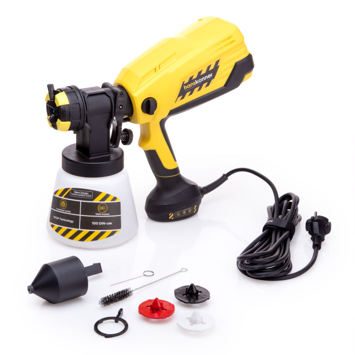 Краскопульт Hanskonner HSG9675P станет лучшим решением для распыления красок, лаков, грунтовок, морилок и прочих растворимых лакокрасочных материалов на поверхностях любой сложности. Он отлично подходит для покраски фасадов зданий и ограждений, а также активно используется при проведении внутренних ремонтных работ, побелке стен и потолков.