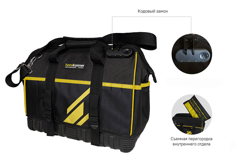 - Особенности : Оснащена кодовым замком для безопасного хранения инструмента внутри. 100% полиэстер выдерживает нагрузку в 30 кг, устойчив к растяжению и стиранию. Дополнительные вставки в стенки сумки позволяют ей лучше держать эргономичную форму при переноске инструментов. Быстрая широкая молния позволяет мгновенно открыть сумку и получить доступ к инструменту. Съёмная перегородка во внутреннем отделе сумки помогает зонировать пространство для инструмента, а так же сама снабжена карманами. Возможность её снятия позволяет полностью контролировать эргономику хранения инструмента. Дно выполнено из пластика для защиты инструмента как от ударного внешнего воздействия, так и от возможного контакта с водой. Удобная скоба для хранения рулетки обеспечивает быстрый доступ к ней. Размер:42x21x33см