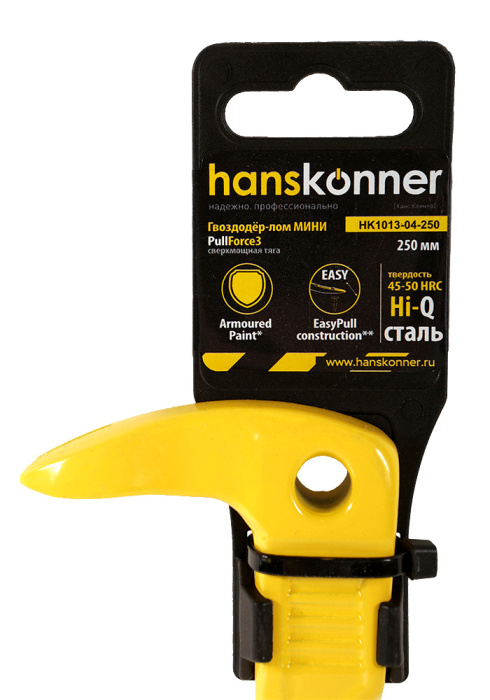 Особенности : Твердость рабочих кромок 45-50 HRC обеспечивает их повышенную стойкость к деформациям. EasyPull construction обеспечивает лёгкое извлечение гвоздей. Специальное покрытие ArmouredPaint (бронированная краска) защищает инструмент от коррозии и внешнего воздействия. |Длина (мм) : 250 |Материал : Высококачественная сталь |Назначение : Ручное рычажно-клиновое приспособлениедля вытаскивания (выдирания) вбитых в материал (дерево, пластик и др.)гвоздей |Артикул : HK1013-04-250 |Производитель : Hanskonner |Длина (мм) : 250 |Назначение : Ручное рычажно-клиновое приспособлениедля вытаскивания (выдирания) вбитых в материал (дерево, пластик и др.)гвоздей |Твёрдость (HRC) : 45-50 |Сечение (мм) : 23x9 |Материал : Высококачественная сталь |Профиль : Усиленный |Габариты в упаковке (ДхШхВ, см) : 32x7,5x2,5 |Основной штрихкод : 4603010111207 |