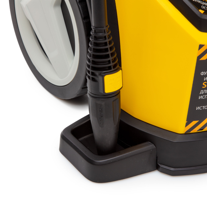 Увеличенный до 7м эластичный шланг высокого давления позволяет свободно мыть автомобиль, чистить крыши дачных построек и другие объекты не передвигая мойку. Благодаря своей эластичности шланг не спутывается и не сковывает движение пользователя в процессе работы.