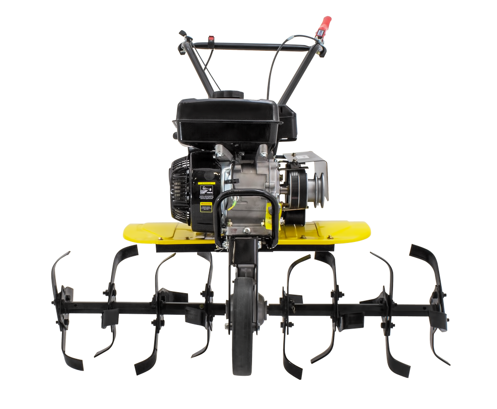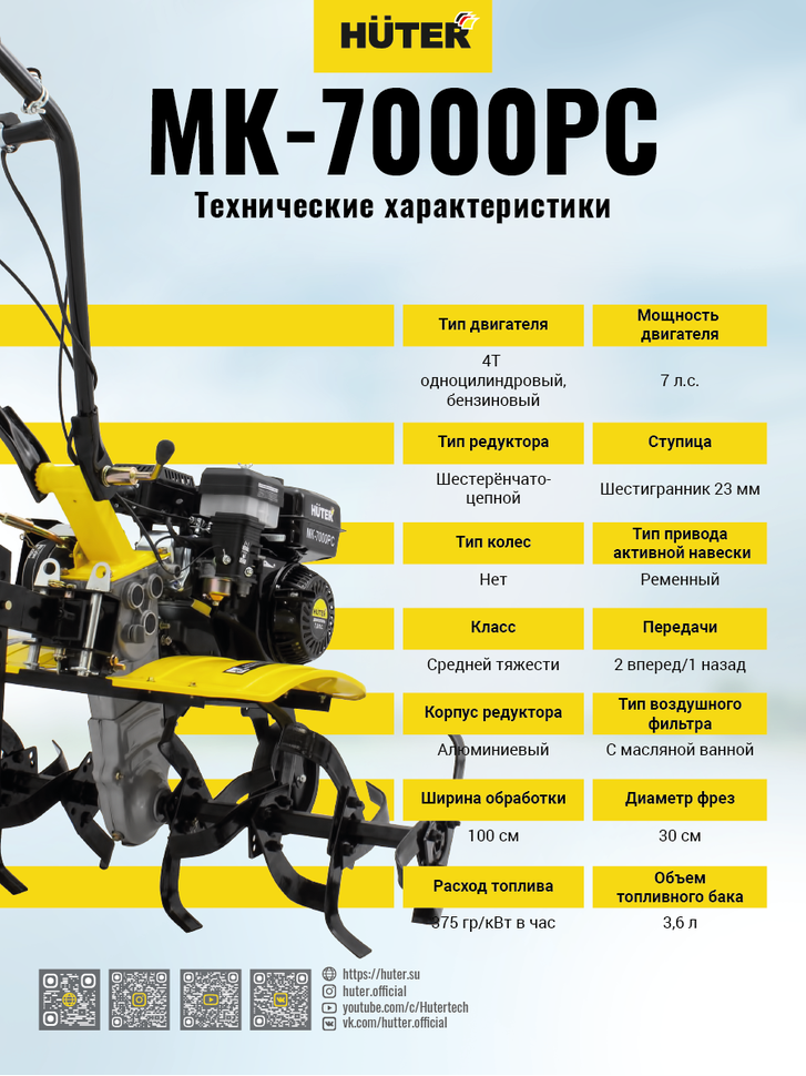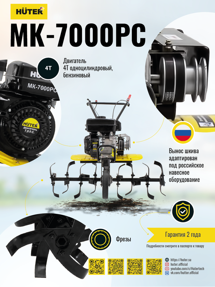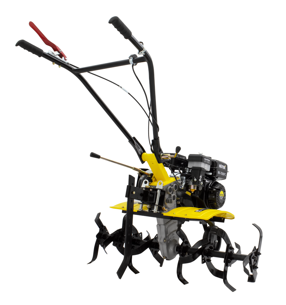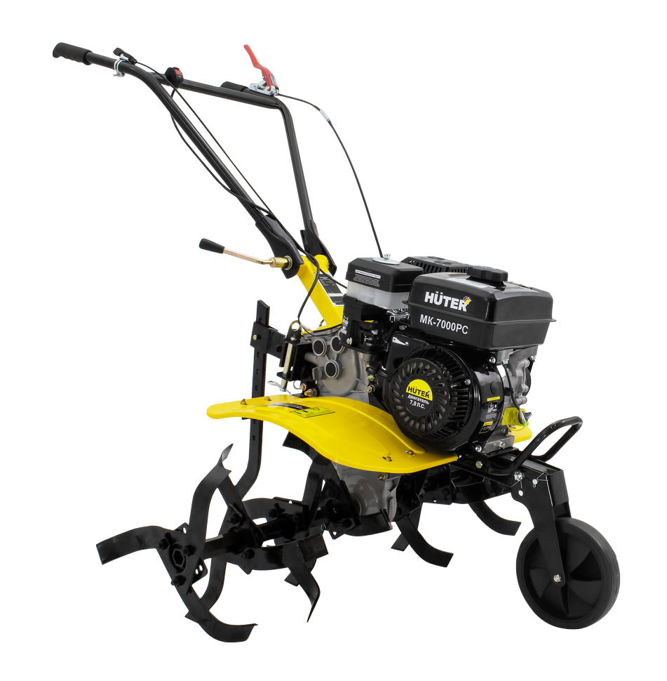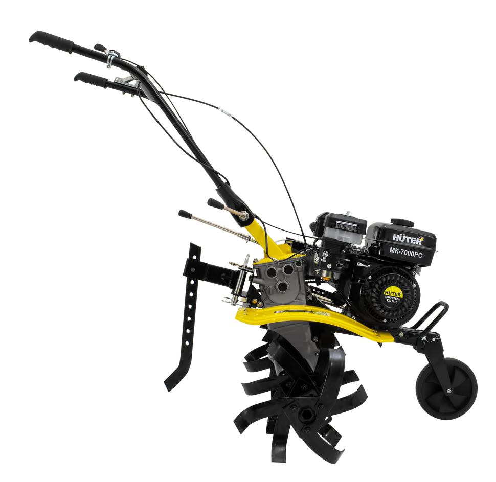 Сельскохозяйственная машина HUTER MK-7000PC – позволяет быстро и качественно культивировать почву, окучивать, рыхлить, выравнивать. А с помощью навесного оборудования выполнять и дополнительные работы по сенокошению, ворошению, уборке снега. Машина подойдет для обработки средних по величине участков. Четырехтактный двигатель мощностью 7 л.с. имеет автоматический регулятор частоты вращения. Тип привода активной навески: ременной. Производитель предусмотрел контроль уровня масла в картере.Мотоплуг имеет ширину обработки 1 м. Изменение количества фрез дает возможность использовать мотоплуг на рядках меньшей ширины. Диаметр фрез составляет 30 см. Глубину обработки можно отрегулировать с помощью сошника.Наличие двух передач вперед, позволяет выбрать оптимальный режим вспашки, а режим заднего хода увеличивает маневренность машины. Все управление сосредоточено на рукоятке. Переднее колесо облегчает передвижение и служит опорой при стоянке и хранении. Съемные крылья надежно защищают оператора и двигатель от земли.HUTER MK-7000PC работает от бензина АИ-92, топливный бак объемом 3,6 литра. Расход топлива: 375 гр/кВт в час.В отличие от модели HUTER MK-7000Р поставляется без колес.