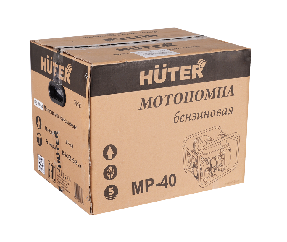 Мотопомпа HUTER MP-40 – это компактный водяной насос, который может использоваться для водоснабжения, перекачки воды из бассейна или пруда, откачки воды из подвалов, полива садовых и огородных участков, тушения пожаров и других целей. Бензиновые мотопомпы отличаются высокой производительностью и автономностью поэтому также хорошо подходят для фермерских хозяйств и разных отраслей бизнеса.Четырехтактный двигатель мощностью 2,8 л.с., способен перекачивать 300 л/мин. Высота напора может достигать 30 м. Устройство может подавать воду с глубины до 8 м. Диаметр входного и выходного патрубка для данной модели 40 мм.Бензиновая мотопомпа комплектуется специальной металлической рамой, которая защищает агрегат от повреждений и обеспечивает ему хорошую устойчивость. Водяной насос HUTER MP-40 имеет компактные размеры, поэтому его удобно перевозить в автомобиле и переносить в руках. Воздушный фильтр, топливный кран и другие комплектующие имеют удобное расположение, что существенно упрощает техническое обслуживание и ремонт. Надежный стартер обеспечивает простой пуск двигателя при любых условиях.