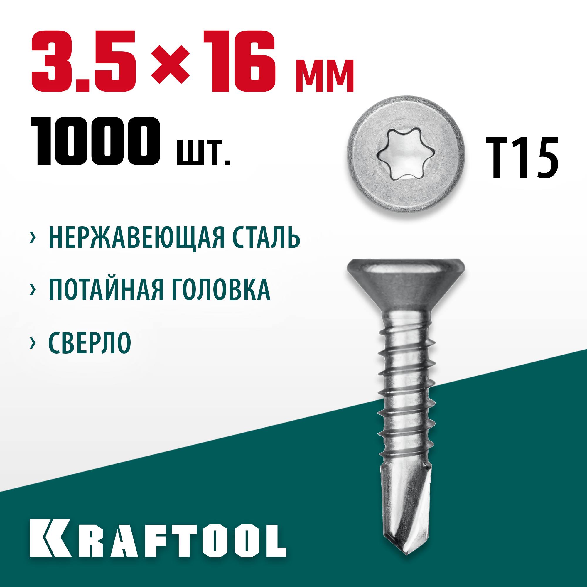 KRAFTOOL 16 х 3.5 мм, 1000 шт., нержавеющие саморезы НС-П с потайной головкой 300932-35-016