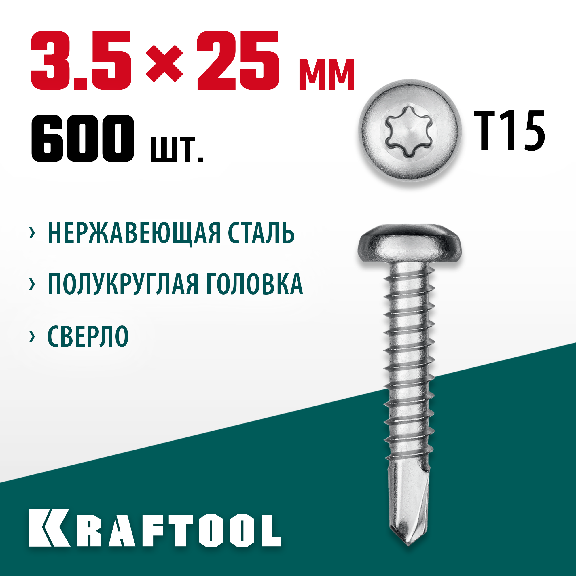 KRAFTOOL 25 х 3.5 мм, 600 шт., нержавеющие саморезы НС-ПК с полукруглой головкой 300931-35-025