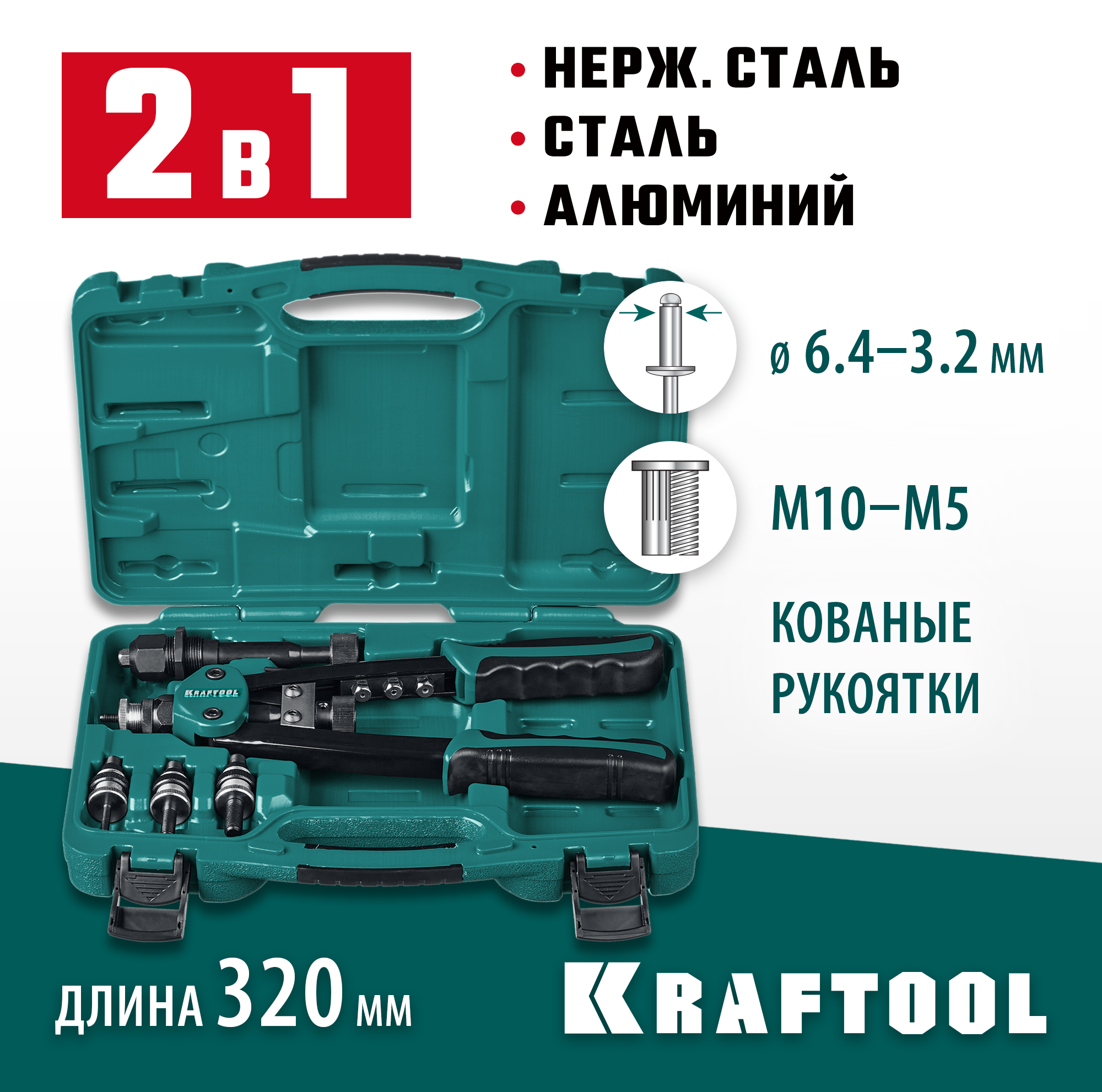 KRAFTOOL резьбовые заклепки М5-М10, вытяжные 3.2-6.4 мм из алюминия, стали, нерж. стали, заклепочник 31181