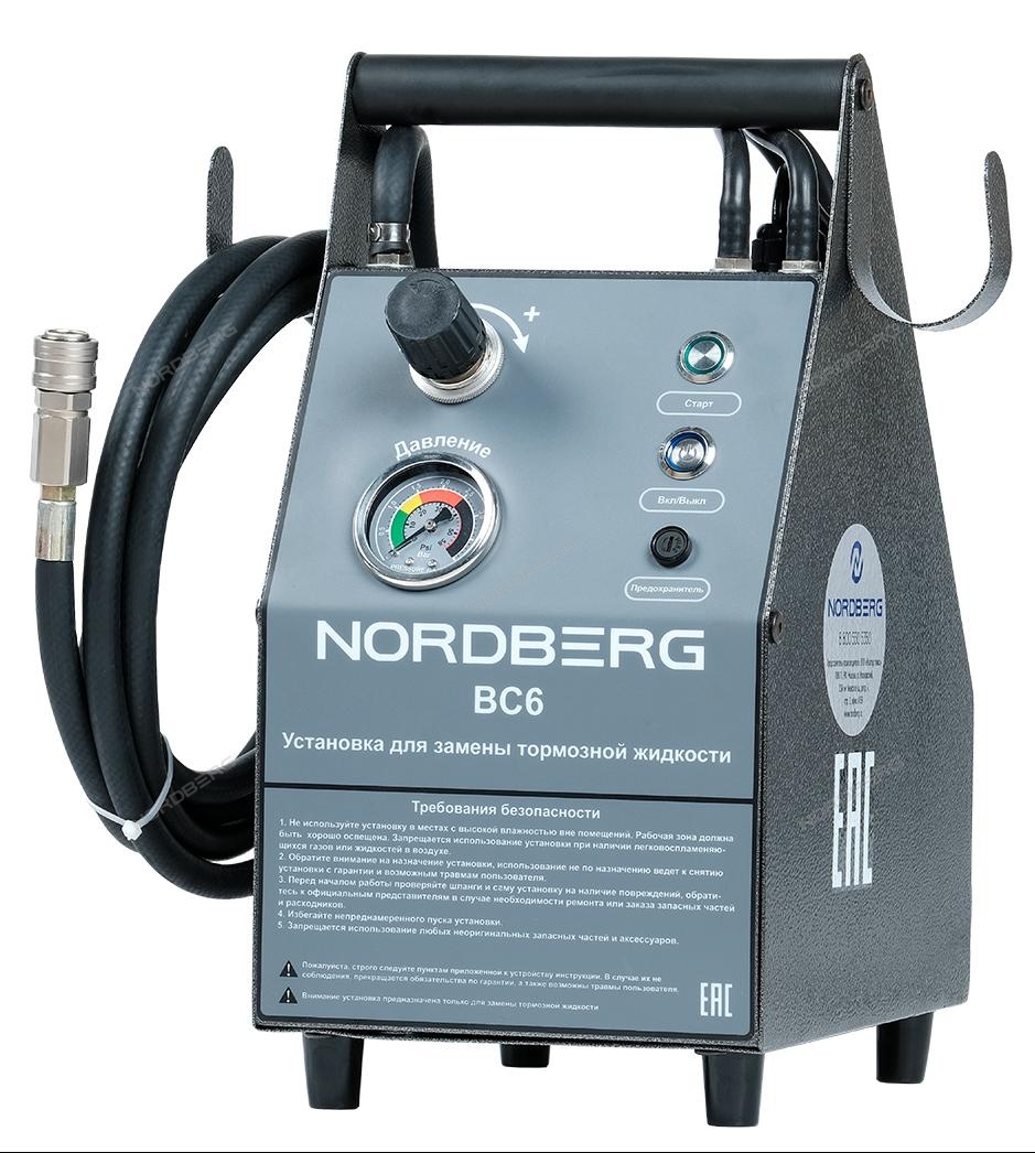 Установка электрическая для прокачки тормозной системы и системы сцепления Nordberg BC6. Емкость бака 5 л. Удаление и замена жидкости в большинстве типов и моделей тормозных систем автомобилей. Подходит для тормозных систем легковых автомобилей и легких грузовиков.