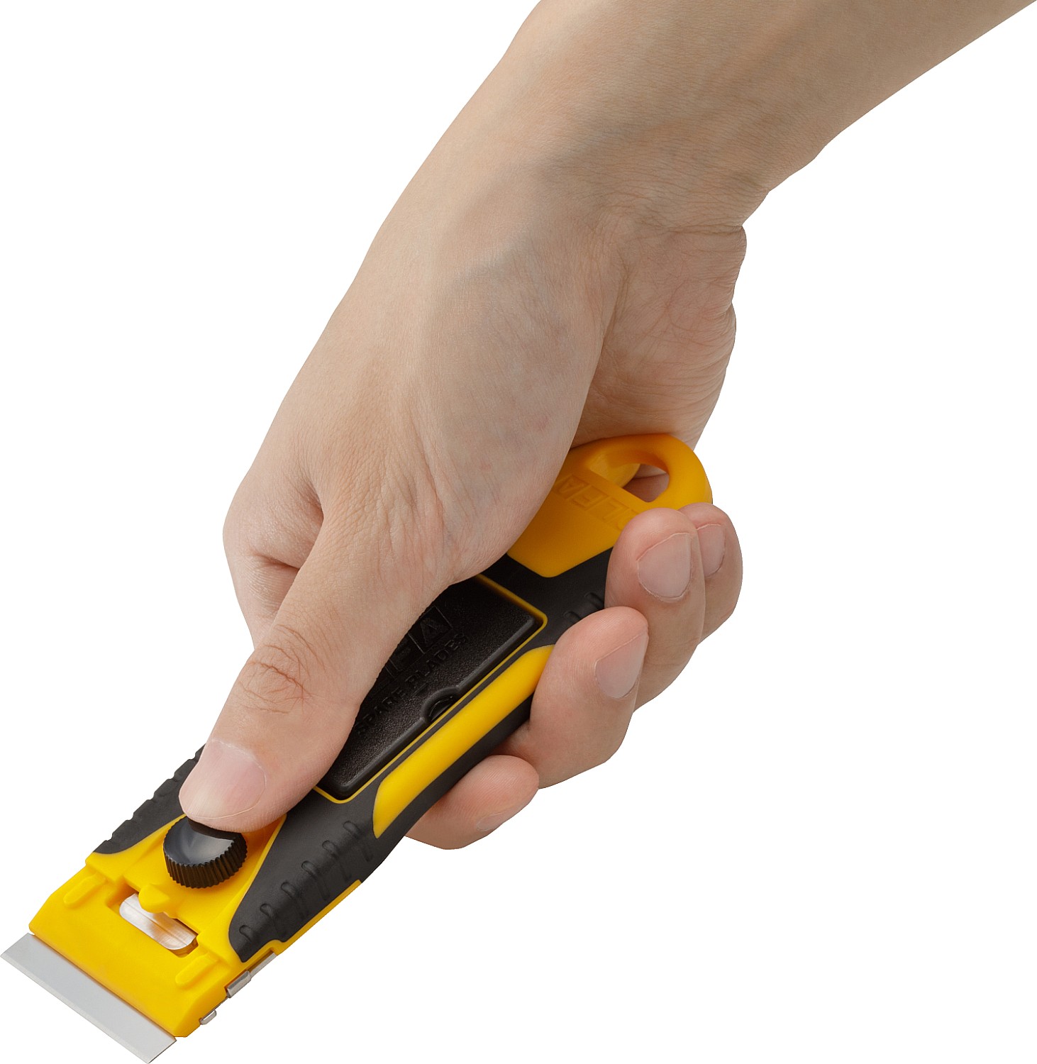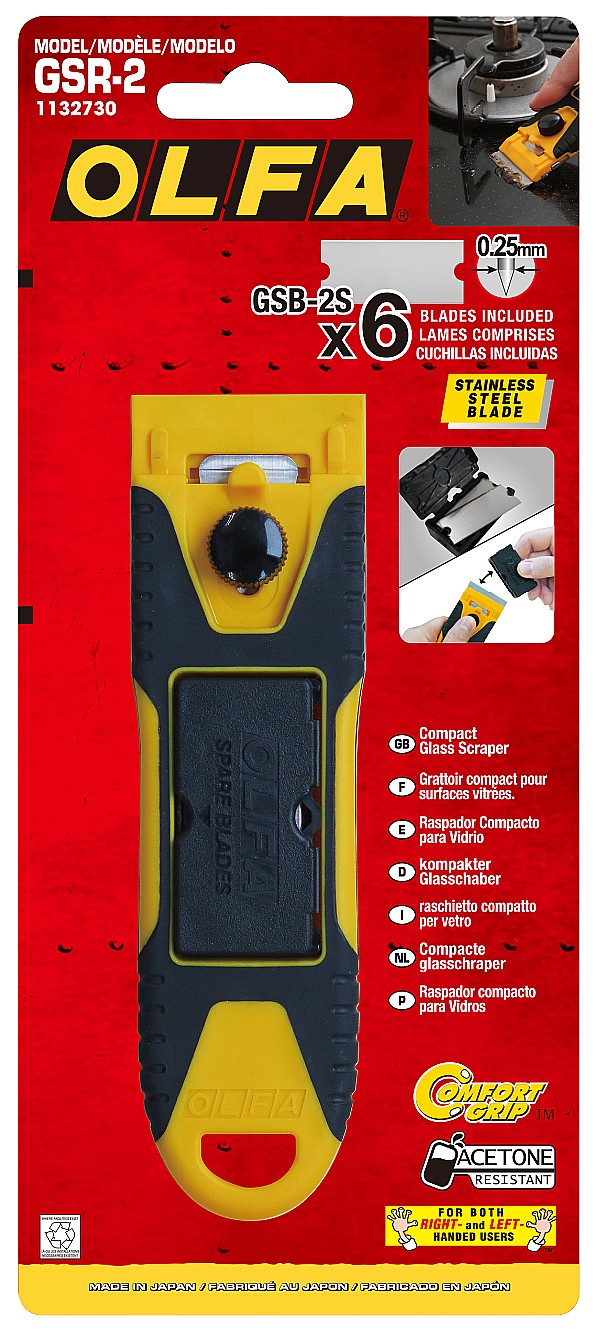 Скребок OLFA OL-GSR-2 предназначен для зачистки стеклянных поверхностей от различных загрязнений. Подходит для очистки стекла и небольших помещений на кухне. Компактный скребок OLFA GSR-2 удобен тем, что позволяет устранять загрязнения на небольшой площади в труднодоступных местах и на изогнутых поверхностях. Контейнер для лезвия можно использовать как защитную крышку для ножа. Стойкая к растворителям прорезиненная рукоятка из усиленного фибергласом пластика. Продуманная конструкция: работа как левой, так и правой рукой.