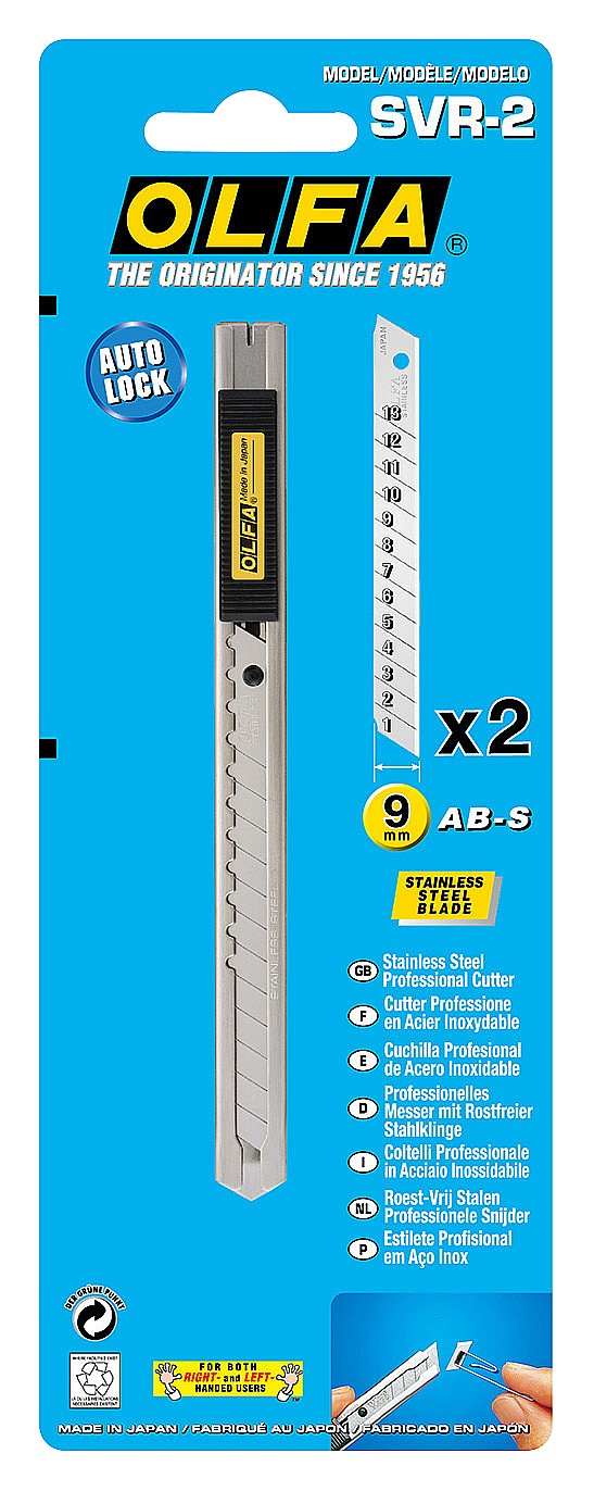 Нож с сегментированным лезвием OLFA OL-SVR-2, предназначен для срезания пленки при тонировании стекол автомобиля, разрезания обоев, бумаги или картона, а также для срезания монтажной пены. Нож SVR-2 обеспечивает высокую производительность и максимальную функциональностью. Подходит для использования во влажной среде, устойчив к коррозии и химическим воздействиям. Рукоятка и лезвие ножа изготовлены из нержавеющей стали, что увеличивает прочность и срок службы инструмента. Обладает простым и надёжным механизмом ''AUTOLOCK'', который обеспечивает фиксацию лезвия. Съемная клипса с прорезью для отламывания использованных сегментов. Легкая замена лезвий без инструментов.