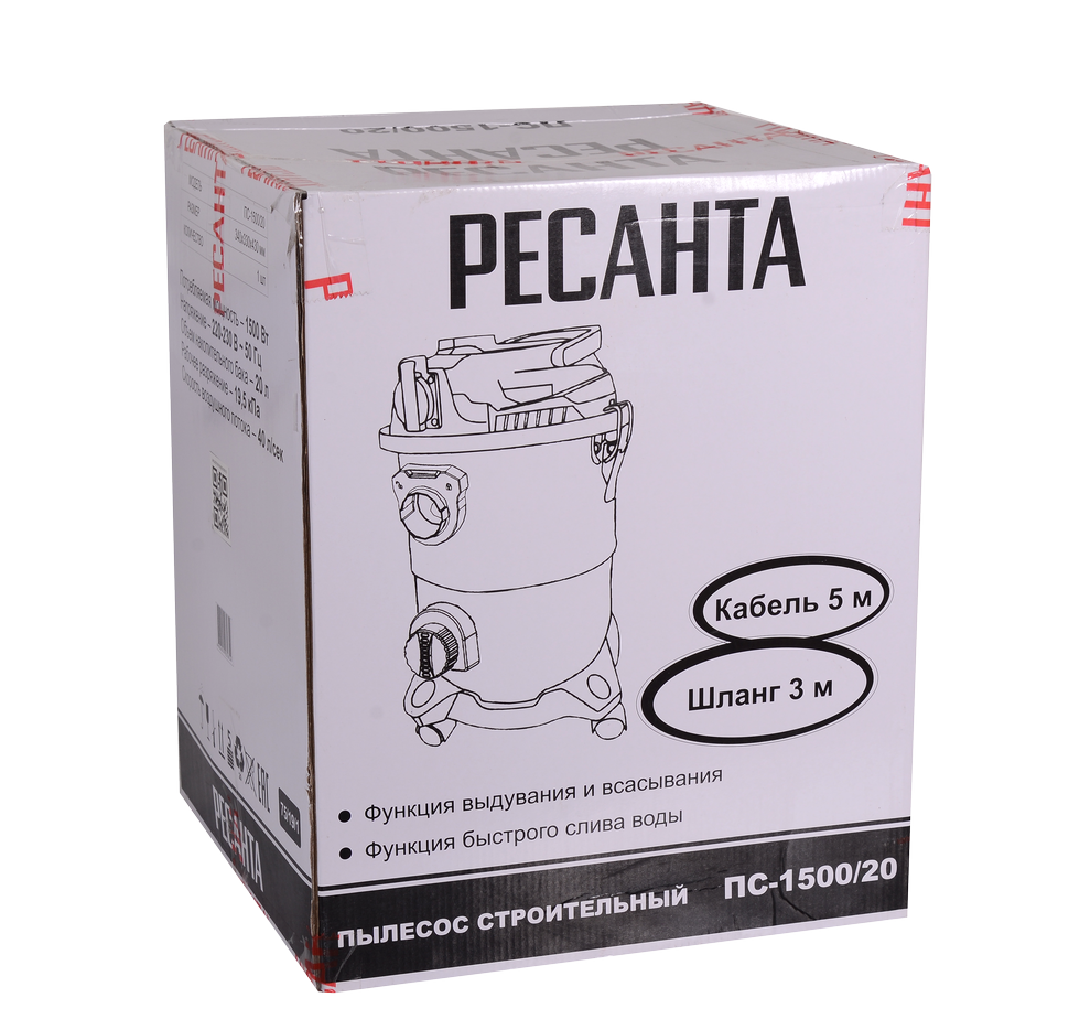 Строительный пылесос Ресанта ПС-1500/20 мощностью 1500 Вт эффективен в быту и профессиональной деятельности. Предназначен для сухой и влажной уборки поверхностей. Скорость воздушного потока 40 л/сек способна удалять не только мусор, но и опилки, мелкие камни, жидкости. Встроенная розетка на корпусе позволяет запускать пылесос одновременно с рабочим инструментом мощностью 100-2000 Вт. Емкость бака составляет 20 л. В комплект входят 2 фильтра, применяемые в зависимости от поставленных задач. Для влажной уборки и всасывания воды предназначен фильтр из поролона. При сухой уборке необходим многоразовый HEPA фильтр. При этом внутрь контейнера устанавливается одноразовый бумажный или многоразовый тканевый мешок для мусора.Строительный пылесос Ресанта ПС-1500/20 работает в двух режимах: обычное всасывание и синхронная работа с дополнительно подключенным оборудованием, таким как перфоратор, дрель, лобзик или шлифмашинка. Функция сбора воды позволяет осушать емкости или удалять пролитую жидкость. Режим выдувания поможет быстро убрать мусор с поверхности или прочистить предмет от пыли. Функциональность прибора обеспечивается насадками, входящими в комплектацию. В сочетании с гибким 3-метровым гофрированным шлангом они гарантируют качественную уборку на любых поверхностях, а также в труднодоступных местах. Трубки-удлинители изготовлены из прочного пластика. Они увеличивают радиус рабочей зоны. Подвижные колеса обеспечивают легкость перемещения.