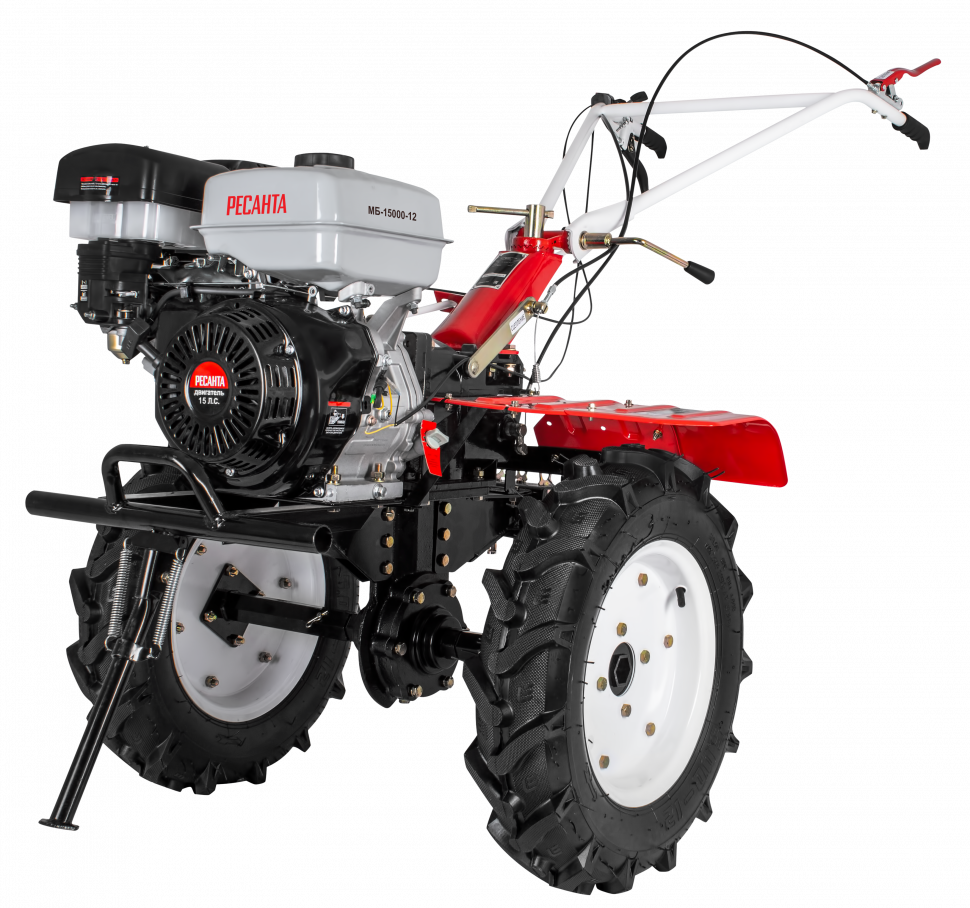 Сельскохозяйственная машина МБ-15000P-12 Ресанта самая мощная модель в линейке. Она подходит для обработки почвы на больших приусадебных участках и территориях фермерских хозяйств. Модель оснащена четырехтактным одноцилиндровым бензиновым двигателем мощностью 15 л.с. Максимальная ширина обработки составляет 140 см, а глубина зависит от положения сошника. Благодаря съемным лезвиям можно уменьшать ширину обработки для культивации пространства между рядами или вокруг деревьев.Большой спектр навесного оборудования расширяет возможности мотоблока. Можно подключать мотопомпы, косилки, картофелекопалки, окучники. Активная навеска подключается через ВОМ 18 мм.Для дополнительной защиты оператора во время работы мотоблок оснащён широкими крыльями. Кожух приводных ремней агрегата препятствует попаданию посторонних предметов (камней, частиц мусора) в лопасти. Шестеренчатый редуктор в масляной ванне защищен надежным чугунным корпусом. Распределительный механизм обеспечивает мягкое нажатие сцепления.Мотоблок поддерживает 3 передачи обработки почвы: 2 в направлении вперёд и 1 назад. Сочетая их с разной глубиной культивации, можно достигнуть оптимального качества обработки почвы. Благодаря колёсам 5х12 с мощными протекторами агрегат может свободно передвигаться по любому грунту.