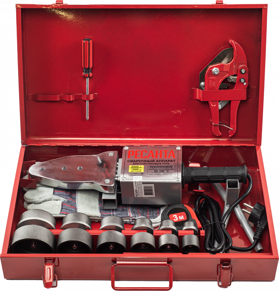 Сварочный аппарат для пластиковых труб Ресанта АСПТ-2000 используется в быту для надежного соединения фитингов и трубопроводов для отопления, холодного и горячего водоснабжения. Два режима работы мощностью 1000 и 2000 Вт обеспечивают температуру нагревателя от 50° до 300° C. Необходимое значение устанавливается с помощью механического регулятора. Время нагревания зависит от диаметра труб.В комплектацию АСПТ входит набор парных насадок диаметром 20, 25, 32, 40, 50, 63 мм. Они соответствуют размерам современных полипропиленовых трубопроводов. Тефлоновое покрытие исключает образование нагара, обеспечивает легкое снятие заготовок и длительный срок службы насадок. Раструбный тип сварки создает монолитное соединение, устойчивое к нагрузкам и вибрации. После нагрева детали необходимо соединить, плотно прижать и дождаться их сваривания. При остывании образуется герметичное соединение.Сварочный аппарат для пластиковых труб Ресанта АСПТ-2000 дополнен ножницами для резки труб, рулеткой, отверткой, имбусовым ключом и защитными спилковыми перчатками. Это позволяет приступить к ремонтным работам без лишних затрат. Устройство поставляется в металлическом кейсе для удобства хранения и транспортировки. Быстросъемная подставка позволяет в перерывах размещать сварочный аппарат на поверхности. Индикаторы включения и температуры позволяют контролировать рабочий процесс. Прорезиненная рукоятка обеспечивает надежный хват.