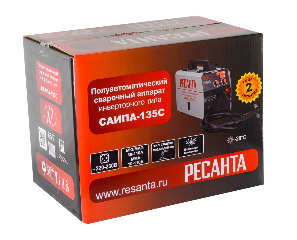 Сварочный аппарат инверторный полуавтоматический РЕСАНТА САИПА-135С с функцией ММА предназначен для ручной электродуговой сварки постоянным током проволокой в среде защитного газа - углекислого, аргона или их смеси. Применяется для высококачественной сварки низкоуглеродистых сталей, низколегированных и нержавеющих сталей, чугуна и других металлов в строительстве, монтажных и ремонтных работах различной степени сложности. Встроенная защита от перегрева защищает агрегат от поломки. Можно регулировать скорость подачи проволоки и сварочный ток, что позволяет добиться высокого качества сварного соединения.Среди сварочных аппаратов практичными, удобными и многофункциональными являются сварочные полуавтоматы марки Ресанта. Их положительной особенностью признана возможность без усиления дополнительными элементами качественно выполнять сварку как цветного, так и черного металлов. Считается, что полуавтоматическое оборудование весьма просто освоить даже новичку.Особенности и преимуществаДополнительно оборудована функция сварки ММА (помимо MIG/MAG). Таким образом полуавтомат подходит большему количеству покупателей, сомневающихся в выборе сварочного оборудования. Таким образом покупатель за вполне доступную цену получает аппарат обладающий двумя режимами работы.Класс защиты IP 21, то есть 'от крупных частиц и отвесных дождевых капель'.Защита от перегрева и пониженного напряжения сети, что позволяет уберечь аппарат от поломки.Горелка несъемная.Основное преимущество полуавтомата - это то, что аппарат автоматически подает расходные материалы, а точнее электродную проволоку, с помощью которой осуществляется зажигание дуги и сваривание металлоизделия. Данный агрегат получил название полуавтомата, так как позволяет лишь частично механизировать процесс сварки. В отличие от автоматической сварки, которая полностью выполняется запрограммированным оборудованием, в полуавтоматической сварке механизирован только процесс подачи проволоки. Тем не менее, такая механизация позволила значительно увеличить производительность: сварщику нет необходимости прерываться, чтобы заменить электрод, дуга горит более стабильно. Кроме того, сварочные полуавтоматы, в отличие от автоматов, позволяют непосредственно контролировать процесс образования шва. А значит, такие соединения получаются более качественными и требуют меньших доработок.Существуют как универсальные полуавтоматы, так и обычные. Объединяет их то, что все они оснащены механизмом подачи электродной проволоки. Однако, универсальные сварочные полуавтоматы отличаются тем, что имеют более широкое применение, чем обычные устройства. Универсальные полуавтоматы могут применяться как для сварки в среде защитных газов в режимах MIG/MAG, так и для сварки самозащитной проволокой и пр. Режим MIG применяется для сваривания в среде инертных газов, например, аргон или гелий. MAG-сварка проводится в среде активных газов. Кроме этого, некоторые модели имеют режим MMA. Этот режим можно использовать при работе как с черными, так и с цветными металлами. В данном случае полуавтомат используется для осуществления ручной дуговой сварки, которая производится штучными электродами. Данный вид работ проводится при постоянном токе, электронная начинка сама управляет сварочным током, в результа