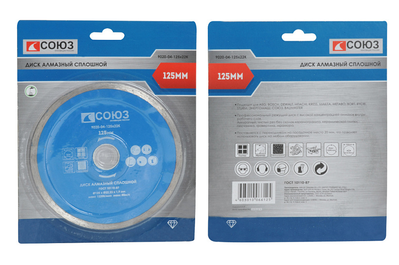 Особенности : Режущая кромка с оптимальным содержанием алмазного слоя обеспечивает эффективную работу и низкую износостойкость, аккуратный, ровный рез без сколов, переходное кольцо на 20мм в комплекте |Диаметр диска (мм) : 125 |Посадочный размер (мм) : 22,23 |Тип кромки : Сплошной |Обрабатываемый материал : Керамогранит, керамическая плитка, песчаник, травертин, мрамор. |Тип реза : Мокрый |Артикул : 9020-04-125x22K |Производитель : СОЮЗ |Посадочный размер (мм) : 22,23 |Высота алмазного слоя (мм) : 7 |Тип кромки : Сплошной |Технология производства : Холодное прессование |Диаметр диска (мм) : 125 |Обрабатываемый материал : Керамогранит, керамическая плитка, песчаник, травертин, мрамор. |Вид упаковки : Блистер |Габариты в упаковке (ДхШхВ, см) : 18x14,5x0,1 |Основной штрихкод : 4603010066125 |
