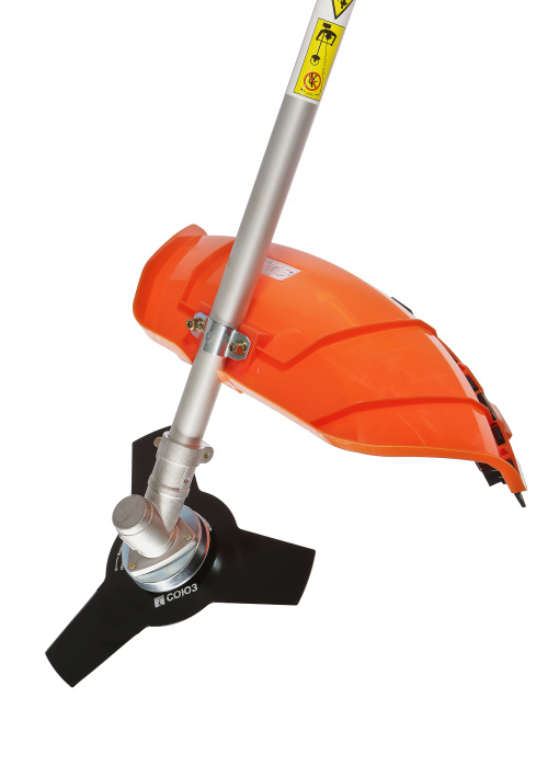 Модель оснащена мощным и экономичным двухтактным двигателем рабочим объемом 42.7 куб см (мощность 3 кВт), позволяющим уверенное использование в качестве режущей оснастки не только косильных головок с леской разных видов, но и металлических ножей, рассчитанных на скашивание густой травы, кустарников, сухостоя. Легкость запуска инструмента гарантирует механизм облегченного старта со специальной дополнительной пружиной. Благодаря праймеру, легкому доступу к свече зажигания, и, полупрозрачному топливному баку модель проста и удобна в обслуживании. Инструмент имеет расширенную базовую комплектацию, куда входят ременной подвес (через одно плечо), косильная головка для лески и трехзубый нож.