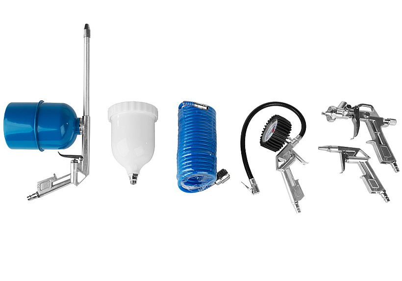 - Назначение : Набор пневмоинструмента для воздушных компрессоров: краскопульт с верхним бачком, пескоструйный пистолет с бачком, моечный пистолет, продувочный пистолет, шланг 5м.