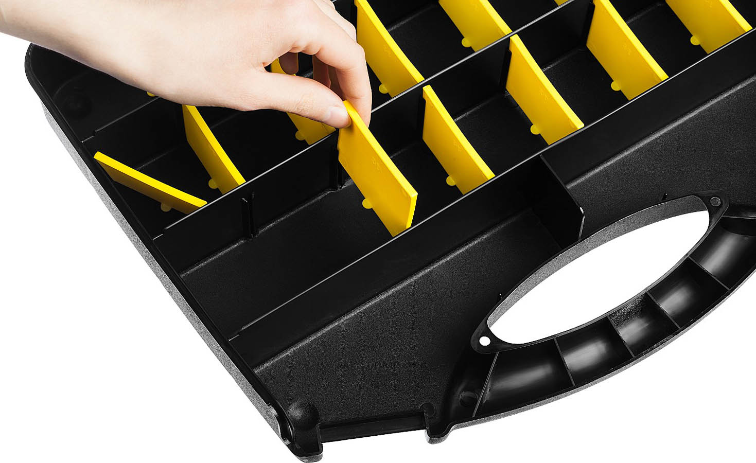 Органайзер STAYER 38038-13_z01, применяется для хранения инструментов и принадлежностей. Большое количество ячеек и возможность их регулирования по ширине позволяет организовать удобное хранение инструментов и принадлежностей.
