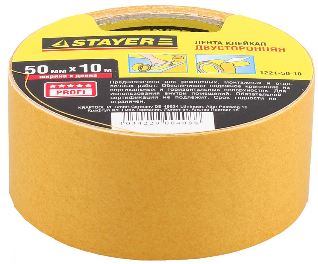 STAYER 50 мм х 10 м, основа полипропиленовая, двусторонняя клейкая лента (скотч) 1221-50-10