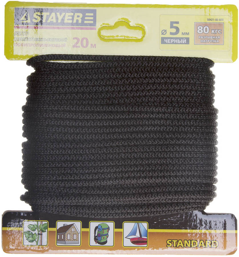 Шнур STAYER 50421-05-020, применяется в сельском хозяйстве, быту, туризме, рыболовстве, для декоративной отделки, а так же для изготовления спортивного инвентаря. Выдерживает высокие нагрузки. Не подвержен гниению и плеснивению. Обладает высокой стойкостью к истиранию и положительной плавучестью.