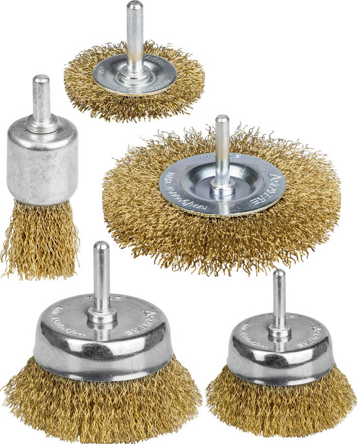 Набор щеток-крацовок для дрели STAYER 35157-H5_z01, для удаления краски, ржавчины, заусенцев, нагара, окалины с поверхностей изделий из стали и цветных металлов. Все изготавливаемые щетки STAYER серии PROFESSIONAL соответствуют действующим стандартам качества и обеспечивают безопасную работу в указанном диапазоне оборотов.