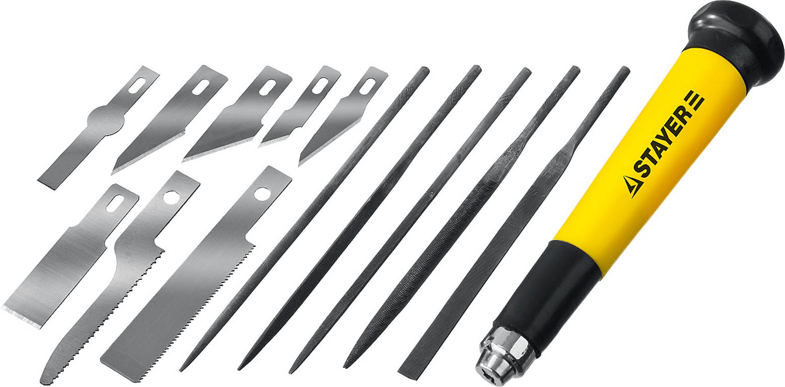 Набор для точных работ STAYER 09145-H38, предназначен для работ с картоном, древесиной, пластиком, металлом. Высококачественные острые лезвия различных форм и размеров, пильные полотна с мелким зубом и надфили обеспечат чистое, точное и комфортное выполнение работ.