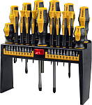 Набор отверток реверсивных STAYER 25312-H37, предназначен для точных работ, в стойке. Специальная стойка-держатель с возможностью установки на стол или подвешивания на стену. Материал стержня и бит - сталь Cr-V. Специально сконструированная двухкомпонентная рукоятка оптимальной формы обеспечивает надежный и комфортный захват. На отвертках имеются лыски для предотвращения скатывания.
