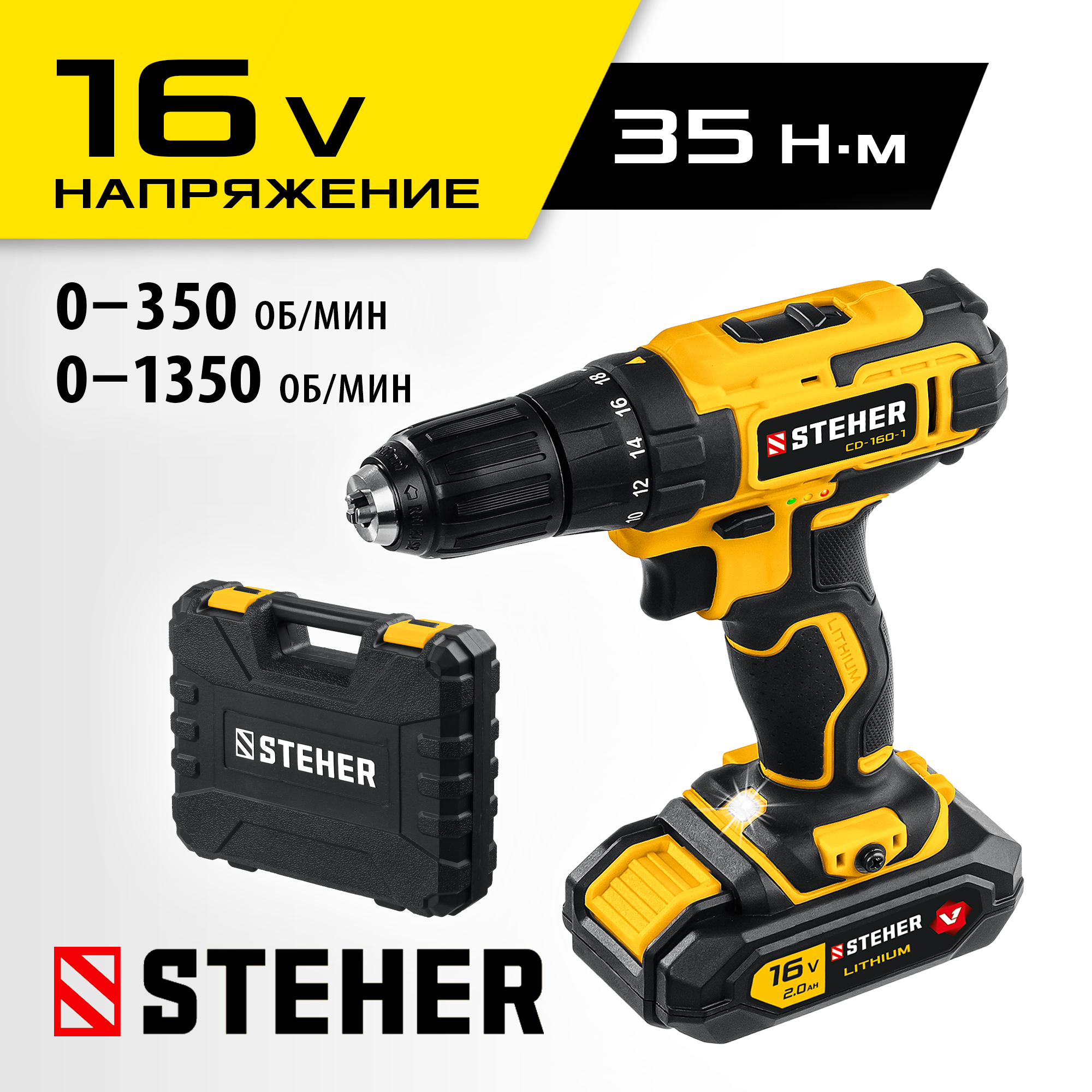 STEHER 16 В, 1 АКБ (2Ач), в кейсе, дрель-шуруповерт CD-160-1
