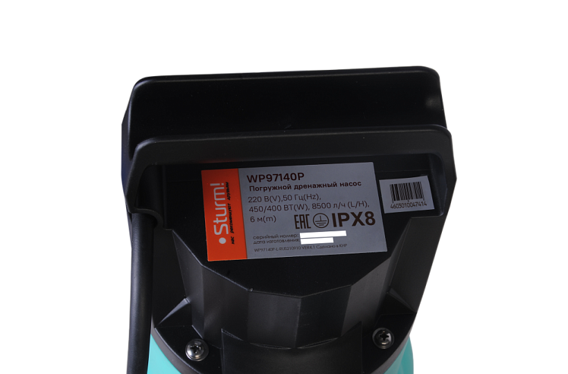 Потребляемая мощность (Вт) : 450 |Максимальный напор (м) : 6 |Максимальная производительность (л/час) : 8500 |Максимальная глубина погружения (м) : 7 |Материал корпуса насоса : Пластик |Напряжение питания (В) : 220 |Артикул : WP97140P |Производитель : Sturm! |Содержание механических примесей : не более 5% от объема воды |Минимальный уровень воды (мм) : 30 |Срок гарантии : 14 мес. |Потребляемая мощность (Вт) : 450 |Длина кабеля питания (м) : 7 |Максимальная производительность (л/час) : 8500 |Материал корпуса насоса : Пластик |Диаметр шланга (дюйм) : 1, 1 1/4, 1 1/2 |Максимальный напор (м) : 6 |Поплавковый выключатель : Да |Максимальная глубина погружения (м) : 7 |Защита от перегрева : Да |Степень защиты : IPX8 |Максимальная температура воды (С) : 35 |Максимальный размер частиц (мм) : 35 |Преимущества : Поплавковый выключатель позволяет использовать насос в автоматическом режиме Встроенная термозащита автоматически остановит насос при перегреве и включит его при остывании до рабочей температуры |Вид упаковки : Коробка |Габариты в упаковке (ДхШхВ, см) : 22x34x16 |Вес инструмента в сборе без упаковки и аксессуаров (кг) : 3 |Основной штрихкод : 4603010047414 |Комплектация : Насос, угловой фитинг, универсальный фитинг, уплотнительное кольцо, инструкция по эксплуатации |