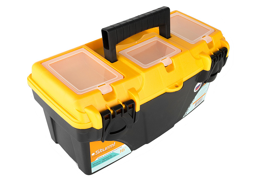 Материал : ударопрочный пластик |Особенности : Прочность корпуса достаточна для использования ящика в качестве подставки как для выполнения работ, требующих опоры, так и для использования в качестве ступеньки при работах на уровне выше человеческого роста. Небольшой вес благодаря специальной конструкции и материалу. |Назначение : Ящик используется для хранения и транспортировки ручного инструмента. Может применяться как в быту, так и в специализированных СТО, автосервисах и на строительных объектах. |Артикул : TBPROF16 |Производитель : Sturm! |Назначение : Ящик используется для хранения и транспортировки ручного инструмента. Может применяться как в быту, так и в специализированных СТО, автосервисах и на строительных объектах. |Материал : ударопрочный пластик |Размер (мм) : 410 х 215 х 197 |Дополнительные характеристики : Небольшие внешние отсеки-органайзеры для метизов. |Габариты в упаковке (ДхШхВ, см) : 41x21x19 |Основной штрихкод : 4603010025580 |