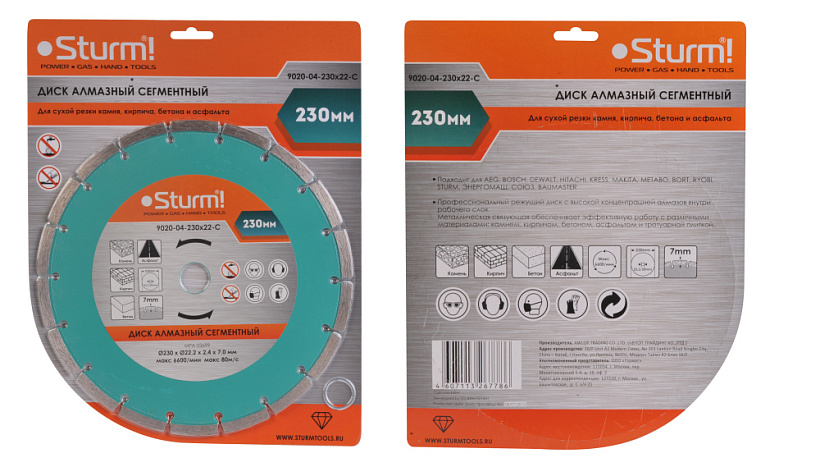 Особенности : Режущая кромка с оптимальным содержанием алмазного слоя обеспечивает эффективную работу и низкую износостойкость, промежутки между сегментами способствуют лучшему охлаждению и выбросу пыли, тело диска, изготовленное из стали марки 65Г обеспечивает его прочность и упругость, переходное кольцо на 20мм в комплекте |Диаметр диска (мм) : 230 |Посадочный размер (мм) : 22,23 |Тип кромки : Сегментный |Обрабатываемый материал : Камень, кирпич, неармированный бетон, асфальт и тротуарная плитка |Тип реза : Сухой |Артикул : 9020-04-230x22-C |Производитель : Sturm! |Посадочный размер (мм) : 22,23 |Высота алмазного слоя (мм) : 7 |Тип кромки : Сегментный |Технология производства : Холодное прессование |Диаметр диска (мм) : 230 |Обрабатываемый материал : Камень, кирпич, неармированный бетон, асфальт и тротуарная плитка |Вид упаковки : Блистер |Габариты в упаковке (ДхШхВ, см) : 32x25x0,3 |Основной штрихкод : 4607113267786 |