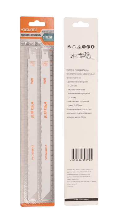 Полотно для сабельной пилы Sturm! 9019-03-S1222VF УНИВЕРСАЛЬНОЕ, изготовлено из биметалла (высокоуглеродистой и быстрорежущей сталей), что обеспечивает прочность тела и устойчивость к затуплению режущей кромки полотна. Полотна предназначены для распила: