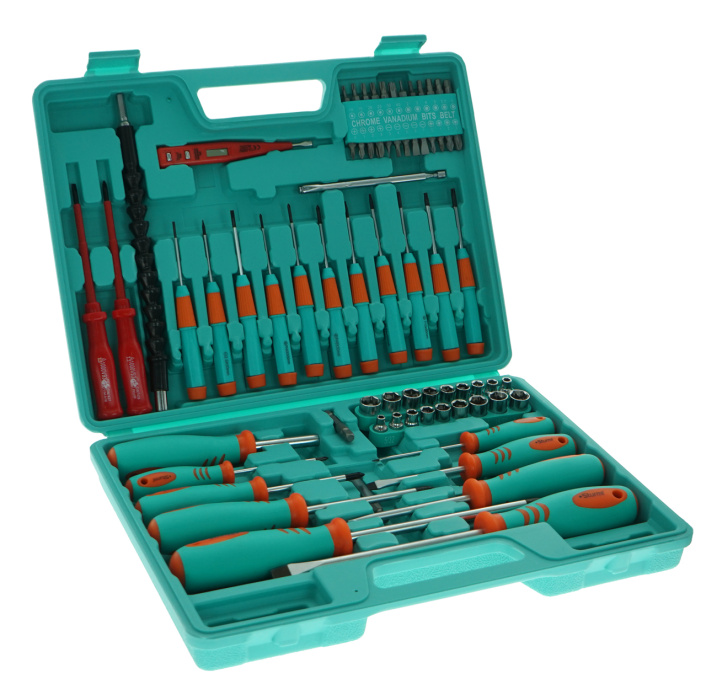 - Комплектация : В комплект входят : отвертки SL: 3×75, 5×75, 6×100, 8×150, PH: 0×75, 1×75, 2×100, 3×150 , держатель для бит 10×40 мм, диэлектрические отвертки: SL4×100, PH1×100, отвертки для точной механики: SL: 2×50, 2.5×50, 3×50,PH: 2×50, 2.5×50, 3×50, TORX: 6×50, 8×50, 10×50, 15×50, 20×50, 25 бит: PH: 0,1,2,3, SL:3,4,5,6,7 мм, PZ: 0, 1,2,3, TORX: 10,15,20,25,30,40, HEX: 2,3,4,5,5,56 мм, гибкий вал 250 мм, магнитный держатель для бит 60 мм, тестер напряжения, адаптер 50 мм, ручка с магнитом, торцевые головки: 5, 6, 7, 8, 9, 10, 11, 12, 13,5/ 32,3/ 16,1 /4,5/16,11/32,3/8,7/16,15/32,1/2''.
