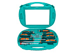- Комплектация : В прочном и удобном пластиковом кейсе-дисплее: отвертки SL: 3x75. 5x75. 6x100. 8x150 мм, PH: 1x75. 1x100. 2x100 мм, Тестер напряжения