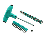- Комплектация : Т-образная ручка-адаптор, биты: SL4, SL5, SL6, PH1, PH2, PH3, HEX4 T10, Т15, Т20, головки: 5,6, 7, 8, 9, 10, 11, 12, 13