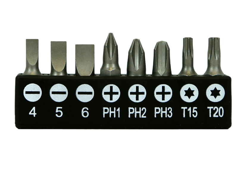 - Комплектация : 8 бит в комплекте: Sl 4мм, 5мм, 6мм PH1,PH2,PH3 T15,T20